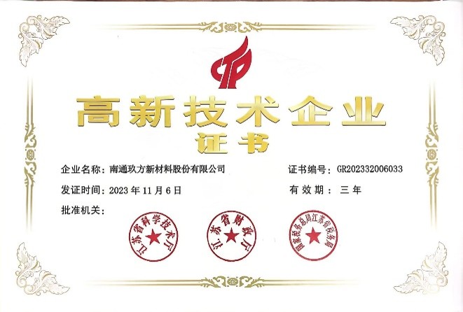 2022年,我公司被认定为“高效太阳能电池载板”企业工程技术研究中心。2023年,被评为省级“创新型中小企业”、高新技术企业。2024年,荣获国家级“科技型中小企业”称号、省级“专精特新中小企业”称号、省级“上云企业”荣誉。同年5月,玖方新材通过了ISO9001质量管理体系、ISO14001环境管理体系、ISO45001职业健康安全管理体系认证,并于8月8日成功在北交所新三板挂牌。2025年,被评为市级“瞪羚企业”。